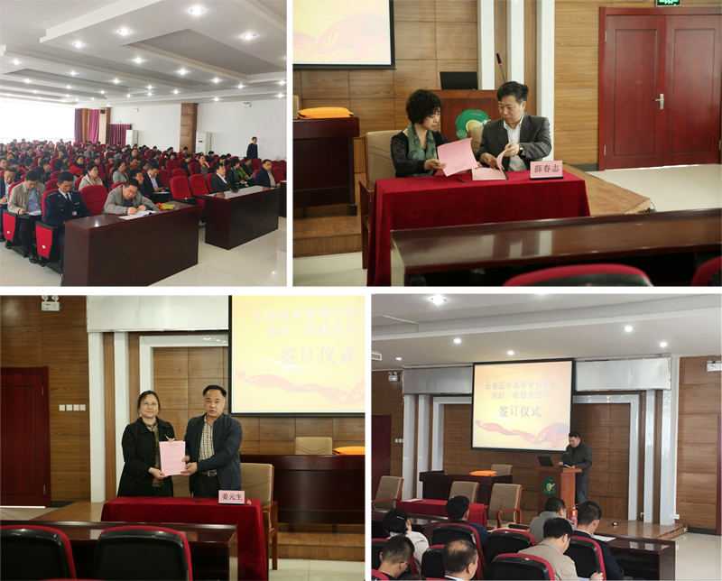 4月26日下午在善教楼二楼报告厅举行了消防会议和消防培训,张鹏飞处长代表校园安全稳定领导小组宣读《长春医学高等专科学校2018年“春夏火灾防控”工作方案》。马维娜书记代表学校总支书记与书记签订综合治理目标责任书,张旭主任代表学校网格长与校长签订消防安全工作责任书。