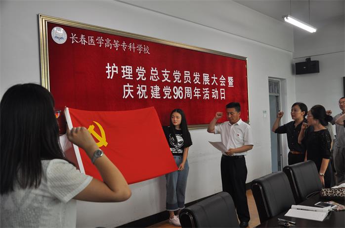 -护理党总支召开党员发展大会暨庆祝建党96周年纪念活动 6月28日下午,护理党总支在善学楼五楼会议室召开党员发展大会暨庆祝建党96周年纪念活动。护理党总支副书记于景龙、副书记王宁、护理学部副主任周银玲等25名党员参加了会议,会议由护理党总支宣传委员林琳主持。