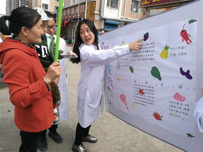 本次实训完成了三项内容,一是利用第三方程序“问卷星”设置二维码,用手机问卷的形式,进行了一次与主题内容相关的营养咨询;二是免费发放了社区卫生服务中心制作的健康教育宣传页;三是展示学生自制的主题宣传画,并给社区居民讲解新版膳食指南和膳食宝塔,以及如何在生活中应用。此次实训结合宣传持续两个小时,问卷星统计宣传调查人数总计203人,获得社区居民的热烈欢迎和鼎力支持。