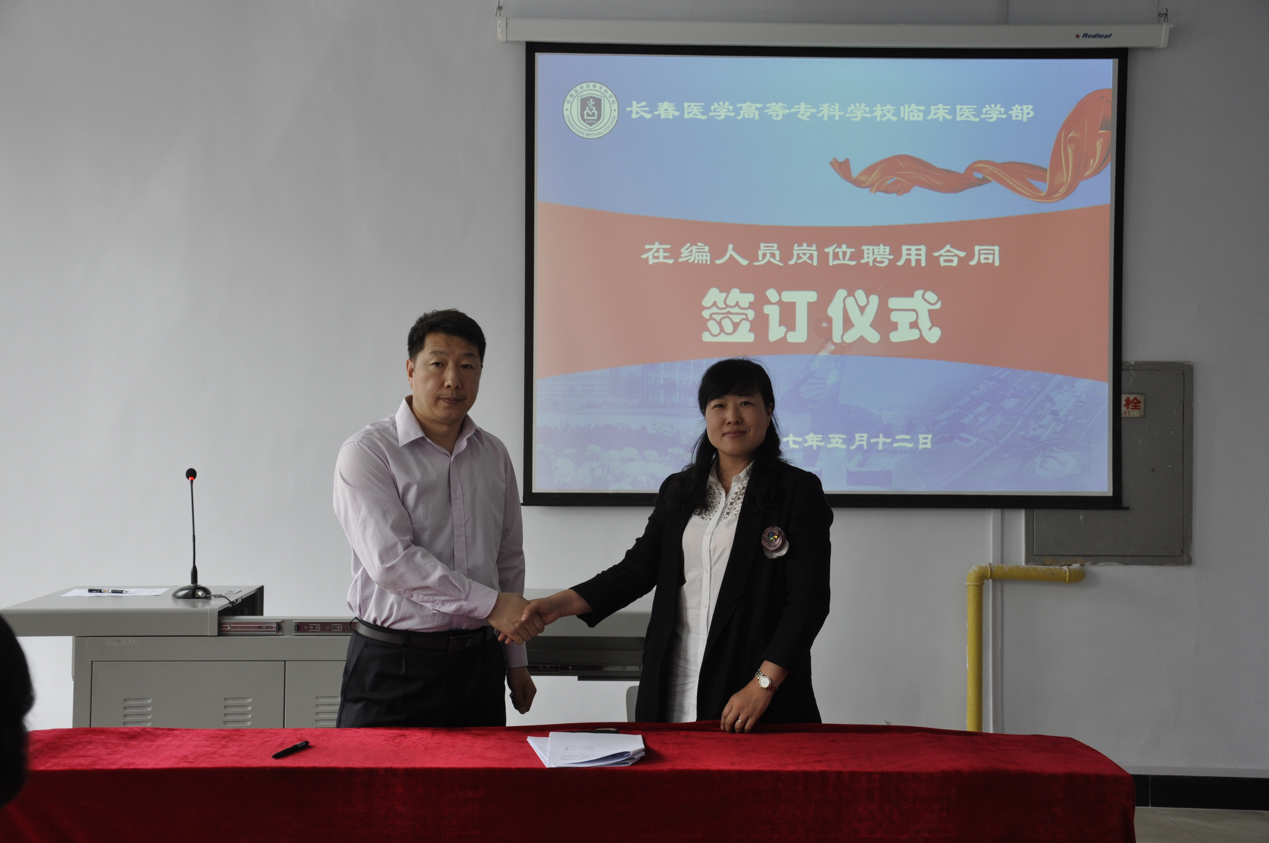 仪式上,高主任介绍了本次举行岗位聘用合同签订仪式的目的和意义,然后按系部职能划分,赵冰主任和刘洋主任分别与医疗组和教学组的19名教师代表逐一签订岗位聘用合同,全体与会教师共同见证了校系二级管理迈出崭新的一步。