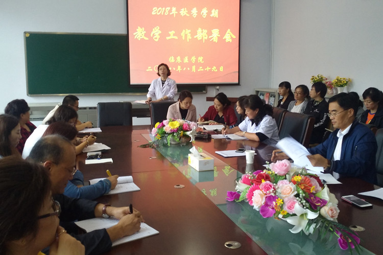 8月29日中午,临床医学院在医学楼三楼会议室召开了2018年秋季学期教学工作部署会,学院全体专任教师参会。副校长袁兆新及教务处相关人员出席会议。会议由学院副院长张虹主持。