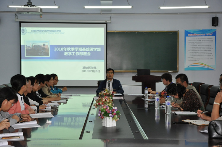 基础医学部主任王春梅根据期初校领导讲话精神,围绕学校诊改工作,从课程建设、师资队伍建设、教科研工作、信息化教学工作、2019版人才培养方案修订工作、生命科学馆社会服务工作、院部信息化管理等方面对基础医学部2018年秋季学期教学工作进行了部署。