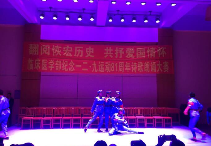 12月7日,“翻阅恢宏历史 共抒爱国情怀”纪念一二•九运动81周年诗歌朗诵大赛决赛在达人厅举行。同学们以诵读爱国诗歌,配以舞蹈、演唱等各种形式缅怀先烈、歌颂祖国。经过近半个月扎实而充分的准备工作,进入决赛的班级服装统一队形整齐,表演到位,主题鲜明,饱含了对“一二•九”运动中英雄的无限崇敬和对祖国繁荣富强的美好祝愿。最终16级口腔本科班摘得桂冠。