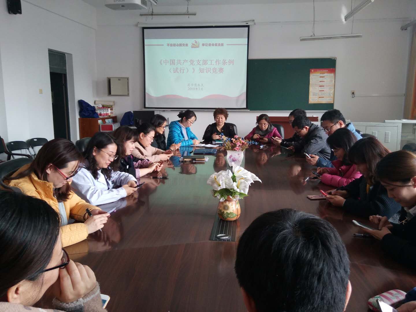 为更好的学习和领会习近平新时代中国特色社会主义思想,扎实推进党支部建设标准化工作,大力提升基层党建工作水平,3月27日下午,药学党总支组织全体党员在六楼会议室开展了《中国共产党支部工作条例(试行)》知识竞赛。