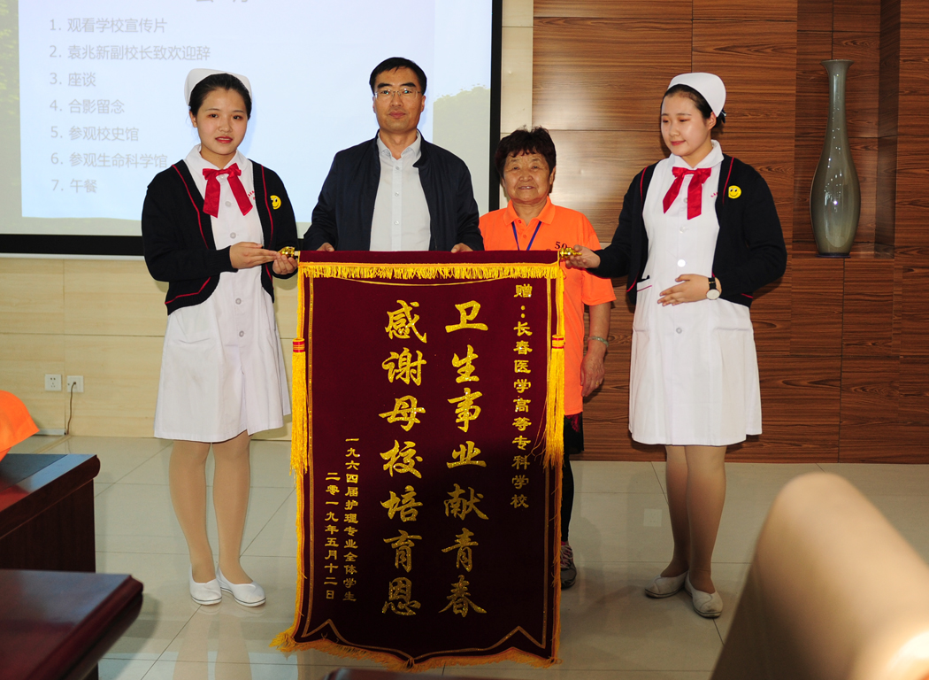 王凤琴校友发言,她说:“尽管毕业已55年了,但对母校的爱从未改变,也从未忘记母校对我们的教育和培养,感谢恩师带领我们走进医学殿堂,因为母校,得到了更多的关注和机会,母校让我们受益终身。”同时,她代表全体同学向母校献锦旗,锦旗上书“卫生事业献青春、感谢母校培育恩”,表达了校友们悠悠学子心,母校浓浓深情。