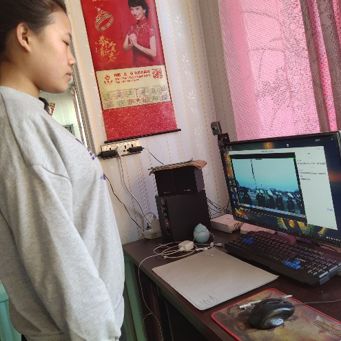 2月27日开学第一天,早上7:30分,药品食品学院进行举行了一次特殊的线上升旗仪式。伴随着嘹亮的国歌,全体学生和辅导员在各自家中,立正站好,面向湖北武汉方向,面对视频中冉冉升起的五星红旗,行注目礼。当画面中护旗手举起右手时,19级中药班的翟雨朦同学也不自觉地举起了右手向国旗敬礼,这一刻,国旗、国歌深深的印在她的心中。