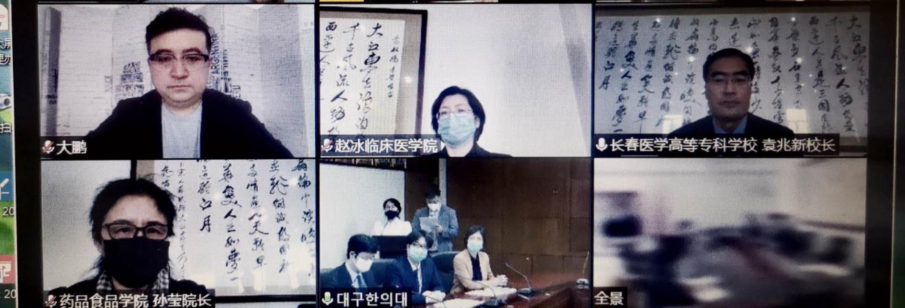 在省市政府近年来大力支持推进中韩合作交流事业的背景下,我校作为高等职业院校,为进一步拓宽中韩合作办学领域、提升国际化人才培养成效,自2019年启动推进与韩国大邱韩医大学药物制剂技术、医学美容技术专业中外合作办学项目。双方院校各层面历经多次洽谈磋商,在专业人才培养模式、课程体系、师资队伍建设、学生实习就业等领域形成了丰富的合作意向成果。“疫情”期间,中韩两校近日隔“空”会面,召开了简约而隆重的合作推进视频工作会。两校高度重视此次会议,双方校长、二级学院院长、国际合作负责人、大邱韩医大学长春办事处代表参会并亲切交流。