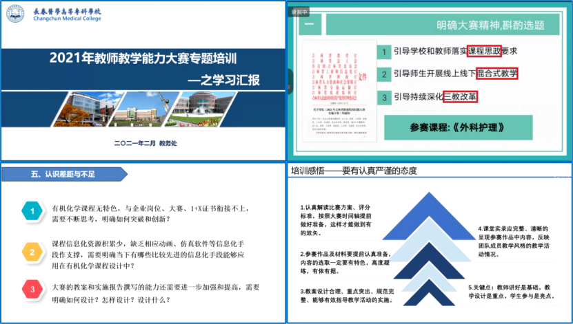 经过各院部的培训和推荐,我校共组建了十支课程参赛团队。会上,田丹等十名老师分别代表各自的课程团队进行了学习分享汇报。她们通过对比赛方案、职教相关政策和历届大赛视频等资料的学习,分别从团队现状、政策解读、学习感悟和存在差距进行了分享;同时,各团队对下一步推进计划进行了简单的规划,提出了改进方案。