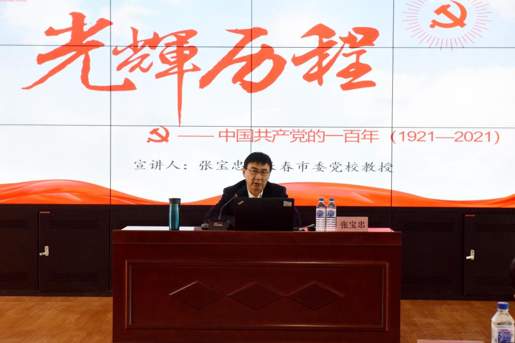学校邀请市委党校张宝忠教授以题为《中国共产党百年辉煌——从1921到2021》作为“师生学党史”活动的第一讲。在近2个半小时的报告中,张教授以学习党史的重要意义、学习党史的目的、如何开展党史学习教育为学习目标,以历史的脉络,为我们展现了四个历史时期的具体时间表和路线图,重点讲述了中国共产党的重大贡献。张教授的讲解既有理论讲解,又有实务指引,有助于师生们更好地理解党史、改革开放史、新中国史,让“四史”学习教育总体上形成聚集效应。从社会主义源远流长的历史中、博大精深的理论中、波澜壮阔的实践中,涵养情操、汲取经验、把握规律,不断增强“四个自信”。