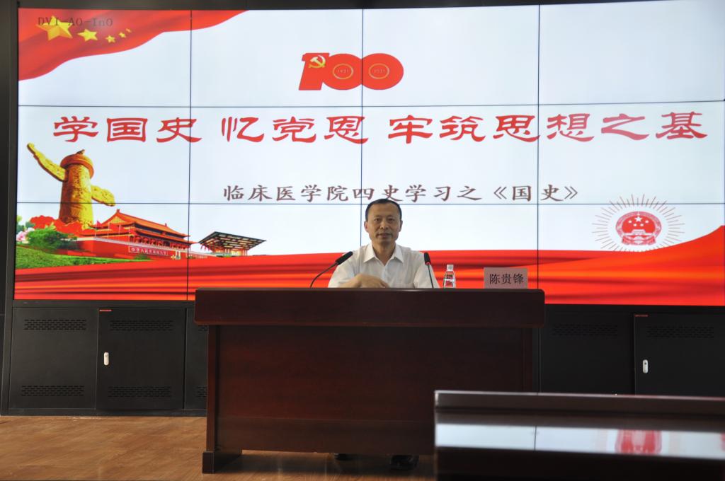 为进一步学习贯彻习近平总书记关于学习党史、新中国史、改革开放史、社会主义发展史重要论述,根据《中共长春医学高等专科学校委员会关于开展“四史”学习教育工作的实施方案》,5月19日下午,临床医学院召开“四史”教育之国史学习会,邀请校党委副书记陈贵锋在善教楼二楼报告厅做“学国史,忆党恩,牢筑思想之基”专题讲座,会议由临床医学党总支副书记杨敬然主持。