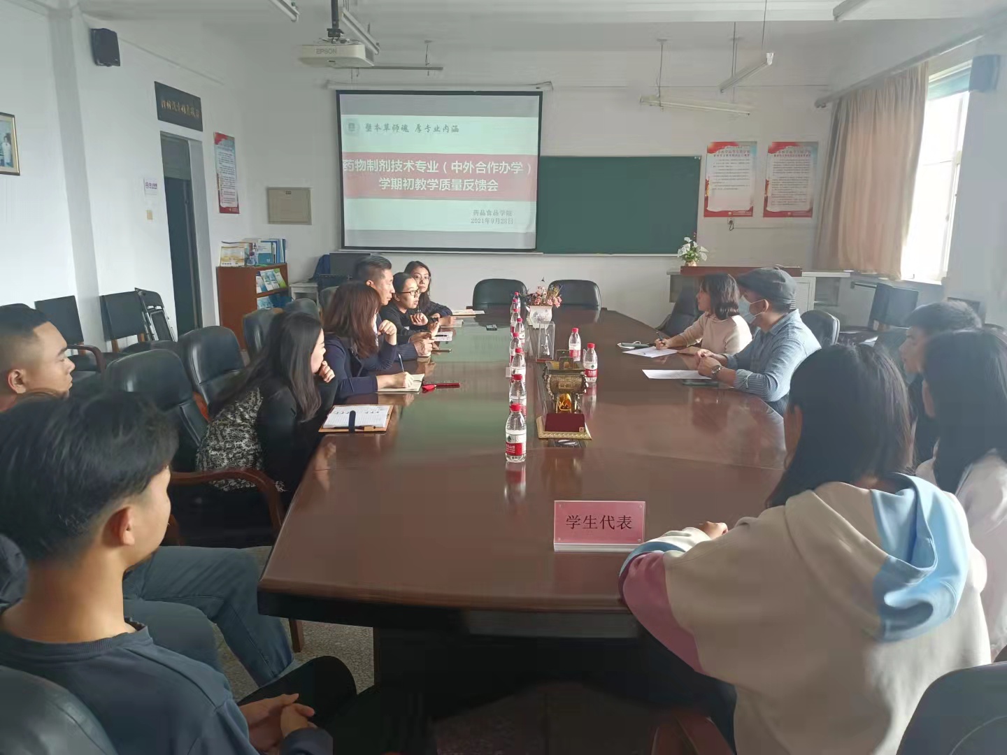为加强药物制剂技术专业(中外合作办学)的教学管理,确保教学质量,9月28日,药品食品学院在六楼会议室召开了药物制剂技术专业(中外合作办学)学期初教学反馈会,大邱韩医大学中方代表单良先生、于波女士及学校教务处副处长张义英、药品食品学院院长于景龙、副院长王月珍、专业带头人及2021级药剂中外合作班级辅导员、学生代表参加会议。