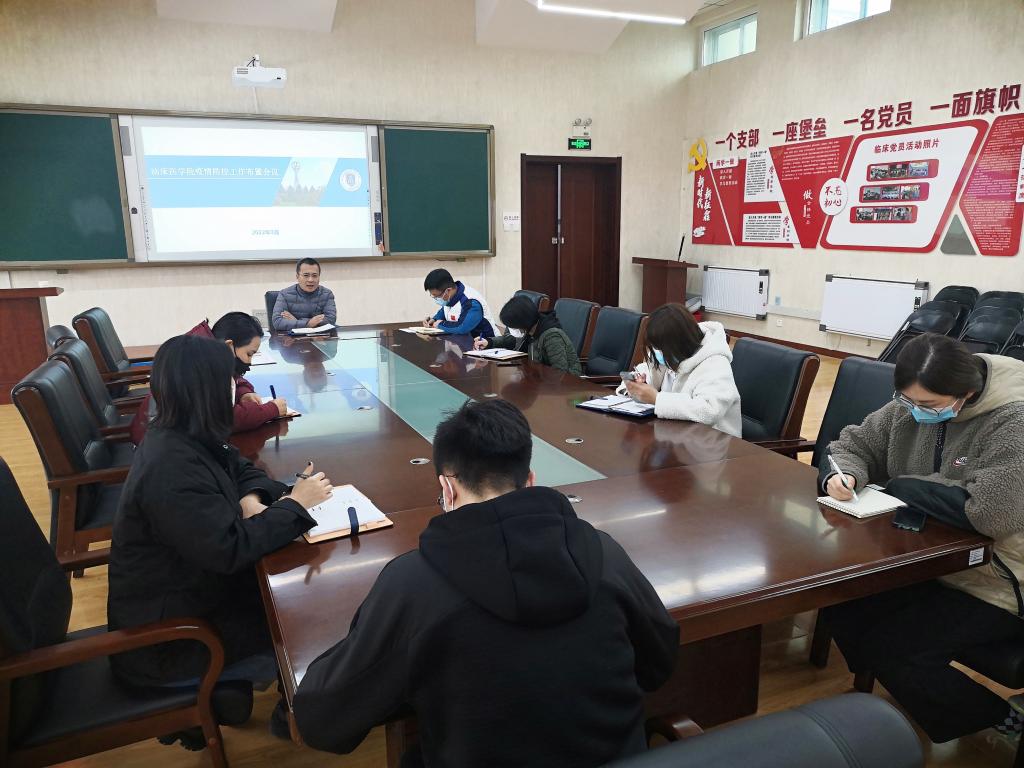 3月12日下午,临床医学院在善学楼五楼会议室召开疫情防控工作布置会议。院长杨智源、党总支副书记杨敬然以及全体专兼职辅导员参加会议。会议采用线下线上相结合的方式举行。