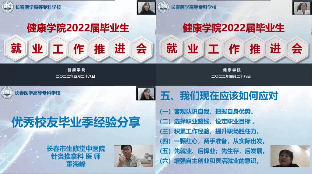 处于实习期间职场第一关键期的健康学子,相继经历了新冠疫情带来的突袭和考验,很多学生已经悄悄走进了志愿者大军中。从冰天雪地到春暖花开,他们在祖国各地严格遵守着属地防疫规定,也为地方疫情防控工作贡献着自己的青春力量。召开这次就业推进会,既是对学生的一种鼓励和肯定,也是为了更好推进就业工作的“最后一公里”做好保障和服务。希望健康学子立足当下,苔花如小米,春日已花开,走入职场、搏击未来。(文图:雷明 审核:季东平 健康学院供稿)