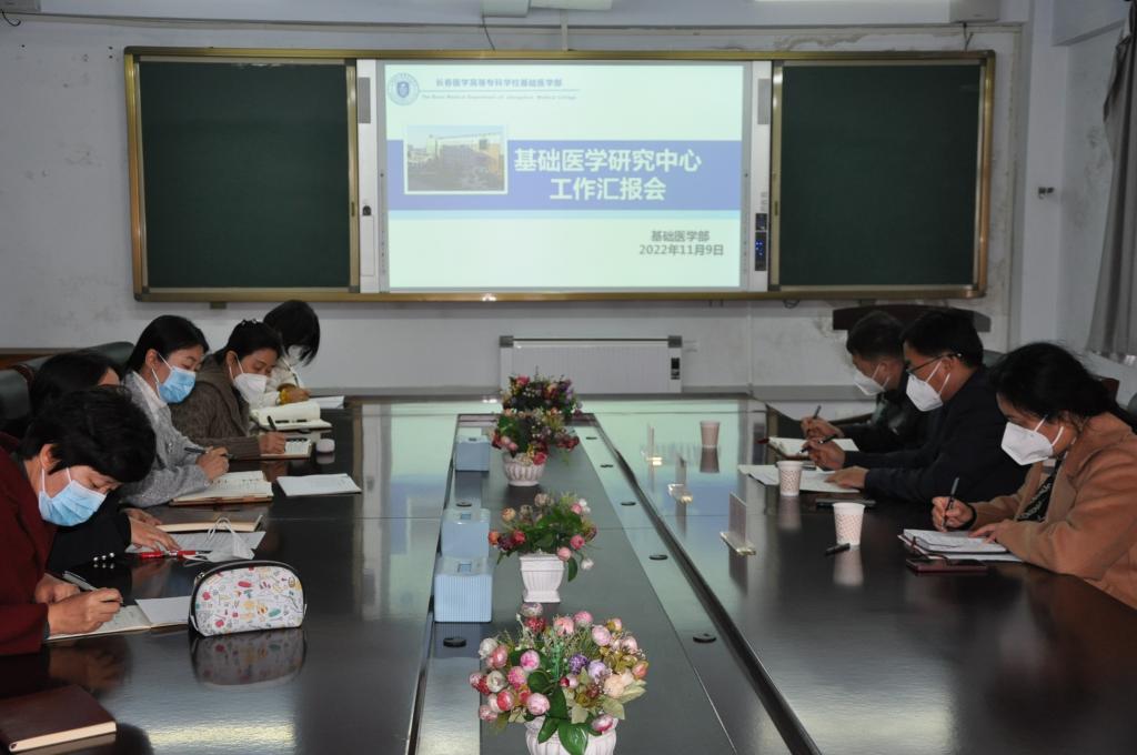 为促进学校科研团队建设和科学研究项目的开展,不断提升教师的科研能力和科研素养,基础医学部于11月9日下午在401会议室召开基础医学研究中心工作汇报会,校长袁兆新、副校长孙莹、科研与发展规划处处长刘洋以及基础医学部科研团队骨干教师和新入职教师参加了会议,会议由基础医学部主任高寒主持。