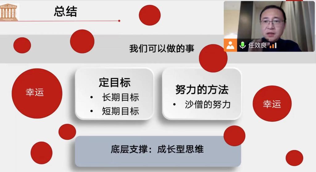 为帮助学生们舒缓疫情下的心理压力,更好地适应大学生活,建立自主学习的习惯,11月9日晚,临床医学院“聿仁讲堂”邀请到积极心理学指导师任效良作题为“‘会’努力,更幸运”的专题讲座,会议由学院学办副主任徐晓玉主持,全院1285名师生在线上参与学习。