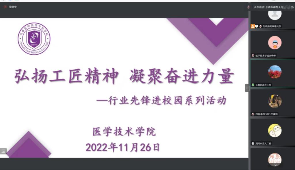 11月23日、26日,长春中妍美容医院院长尹玉琴、吉林大学第二医院放射线科副主任技师刘纯岩与医学技术学院师生相约云端,开展“劳模工匠进校园”宣讲活动。医学技术学院副院长王丹主持宣讲活动,全院师生500余人聆听了讲座。