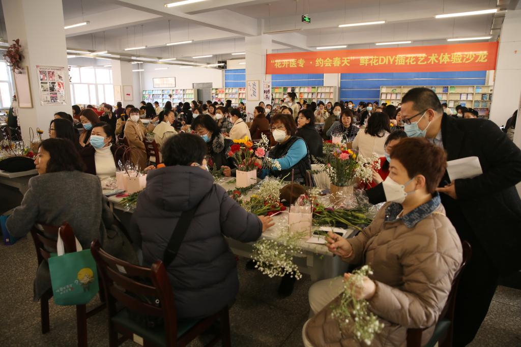 3月8日,为纪念第113个国际劳动妇女节,校工会举办“花开医专 约会春天”鲜花DIY插花艺术体验沙龙活动,活动在图书馆二楼阅览室举行,全体在校校领导和全校292名女职工参加活动,校工会离退休办公室主任郝宇主持活动。