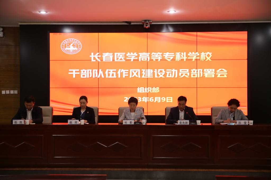 6月9日,学校党委召开加强干部队伍作风建设动员部署会。会议传达了全市加强干部队伍作风建设动员大会精神和长春市卫健系统干部队伍作风建设动员大会的讲话精神,对学校干部队伍作风建设工作进行部署。党委书记杜影主持会议并作部署讲话。党委副书记、校长袁兆新传达省委常委、市委书记张恩惠在全市“加强干部队伍作风建设为全力打好打赢长春振兴突破攻坚战提供坚强保证”动员大会上的讲话精神、市卫健委主任王维学在全市卫健系统干部队伍作风建设动员大会的讲话精神。