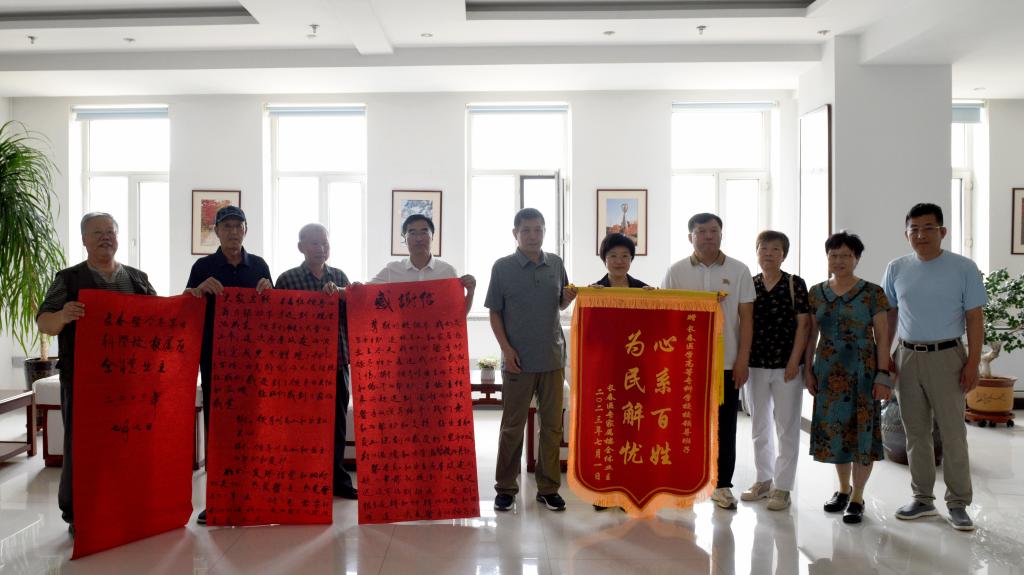 7月7日上午,校园家属区业主委员会张丽芳、王羽等我校退休教师满怀激动的心情为学校送来了一封毛笔书写的感谢信和一幅印有“心系百姓 为民解忧”的锦旗,感谢学校领导班子解决了多年家属区外墙无法保温的老大难问题。学校党委书记杜影、校长袁兆新和副校长李银山代表学校领导班子在善教楼十楼会议室热情接待了各位退休教师。
