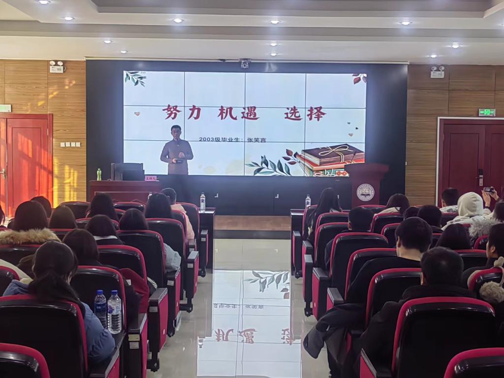 张笑言是我校2006届医学影像学专业毕业生,2022年任公主岭市中心医院副院长。他首先感谢学校的培养和学院搭建的交流平台,在简要介绍医院的基本概况及人才需求后,以“努力 机遇 选择”为主题做了专题讲座。他通过自身实习和工作期间的经历,阐述了医务人员的角色与定位,以及现存医疗环境中如何预防医疗纠纷的有效办法和实用技巧,让同学们对如何正确地构建医患和谐关系有了全新的认识和了解,为今后实习和就业提供了指导和借鉴。他鼓励同学们将基础知识作为新的起点,尽快融入大学学习成长的大环境,在学习过程中把握学习机会,不断磨炼自己,以学习为中心,树立积极向上意识。他明确指出未来的发展趋势是向年轻人靠拢的,建议同学们在未来的学习生活中,要把握机会充实自己,考取各类资质证书,给自己更多选择的机会。
