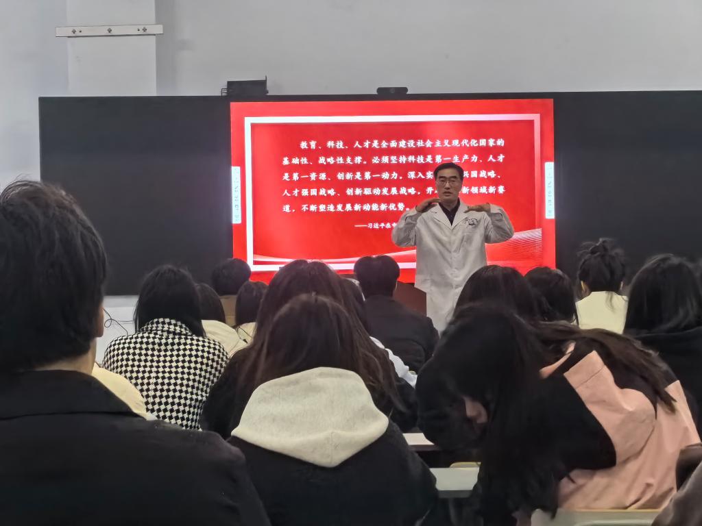 袁兆新本次讲授的主题是“社会主义现代化建设的教育、科技、人才战略”。他用孔子、孟子、梁启超、蔡元培等教育家的事例阐述了我国各时期的教育发展状况;用盾构机、芯片、歼20等高精尖产品阐述了我国科技创新、自主创新和新质生产力,打破西方国家对我们搞封锁、卡脖子的问题;用任正非、雷军、钟南山等现代各行业领军人物的发展历程阐述了人才是第一资源的重要性。随着对这些问题的一一提出和解答,同学们在交流互动中深刻领会到教育强国、科技强国、人才强国的重大战略意义,学习热情被充分点燃,课堂气氛热烈。
