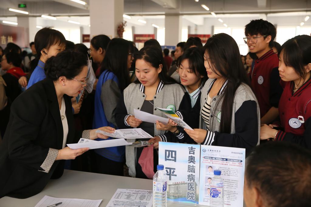 四平市神农医院、四平市吉奥脑病医院、四平市资生康复医院等11家医院参加本次活动,提供就业岗位214个,涵盖临床医学、口腔医学、医学影像技术、中医学、康复治疗技术等专业。来自11家医院的人力资源部工作人员精心准备,积极应对,通过派发宣传册、海报展示以及现场宣讲等方式,让求职学生更快速更直观地了解医院基本概况和独特优势。活动现场气氛热烈,1000多名毕业生及大一、大二在校生纷纷前来现场咨询,工作人员亲切交谈,耐心解答。铁西区人社局设立了政策咨询处,为学生讲解就业、人才、社保政策,现场接待咨询400余次,发放《初次创业补贴政策》《就业政策宣传手册》等宣传材料1000余份。