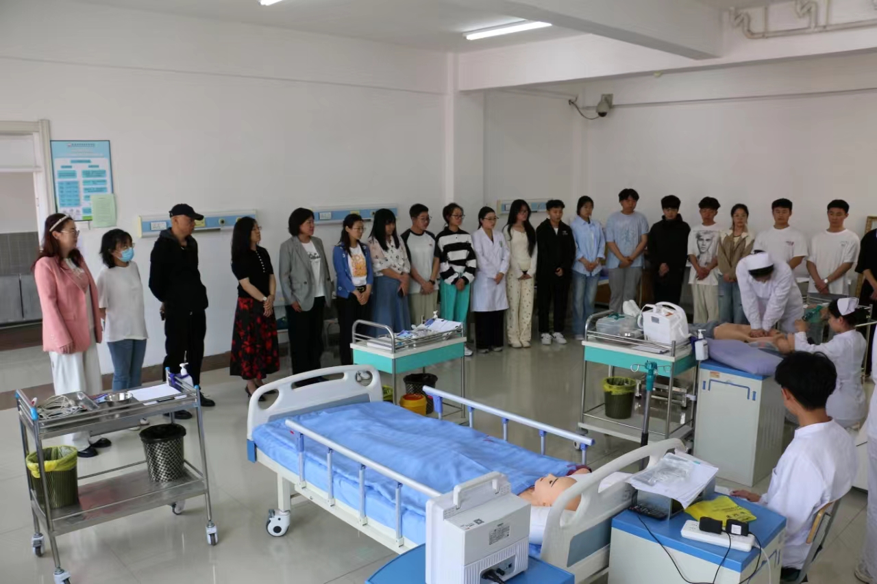 活动地点在模拟医院418实训室,由护理专业获得国赛资格的四名学生进行演示,观摩人员包括健康学院李鸾老师与22级、23级康复专业学生,临床实训部主任张虹及两办人员。