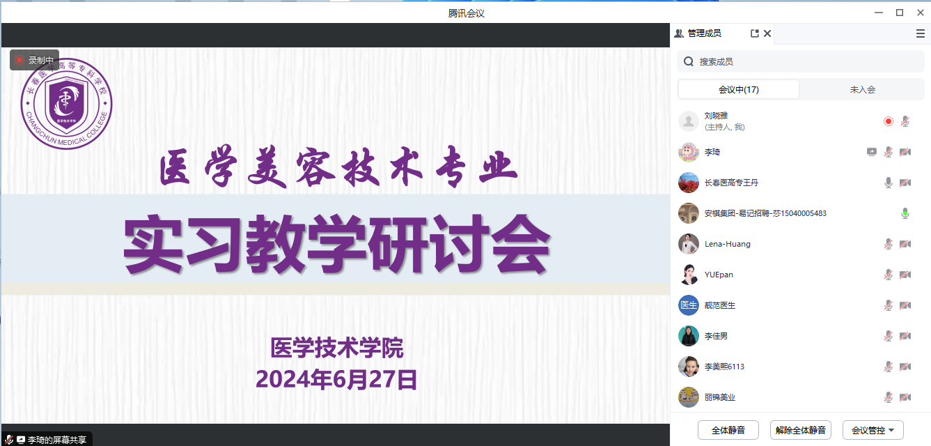 6月27日下午,医学技术学院在线上召开医学美容技术专业实习教学研讨会,各美容实习单位代表和学院相关人员参加会议,会议由副院长王丹主持。