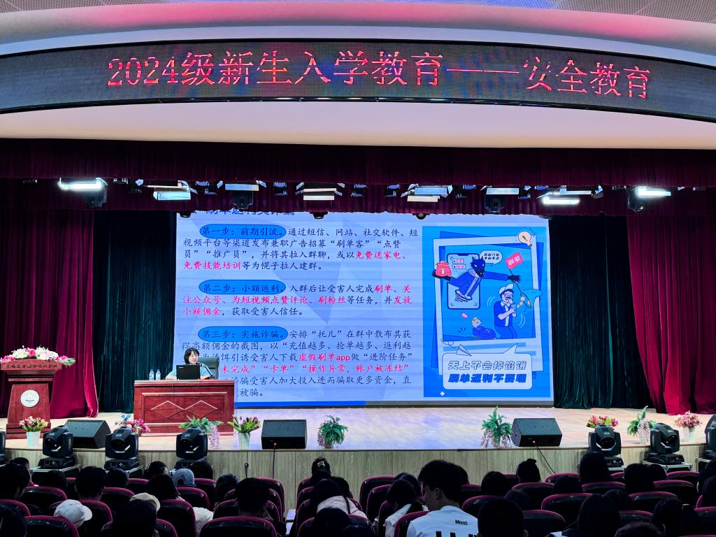 为共筑安全的校园环境,长春市公安局经开分局刑警大队一中队副队长聂硕为同学们作了题为《青春守法,警防有诈》的反诈专题讲座。聂硕结合大学生受骗案例抛砖引玉,围绕电信诈骗的概念、类型和防范方法进行了详细介绍,帮助新生增强安全防范意识和法制观念,有效赋能平安校园建设。