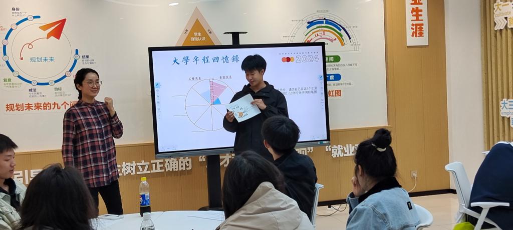 刘力为以优秀毕业生创业经历入手,巧妙地为团体成员逐渐唤醒生涯意识。随后,她精心设计了“大学半程回忆录”“职业发展澄清表”和“拯救曹操华容道”等一系列沉浸式主题互动活动,通过对学生们表现的即时反馈与精妙点拨,引领学生们在实践操作中深入探索自我认知的广阔世界。这些活动不仅促使学生们不断明确自身的价值观与时间观,还显著提升了学生们的自我觉察能力,为确立未来的学业与生活目标奠定了坚实的基础,并促使他们做出明智的生涯决策与积极的行动。