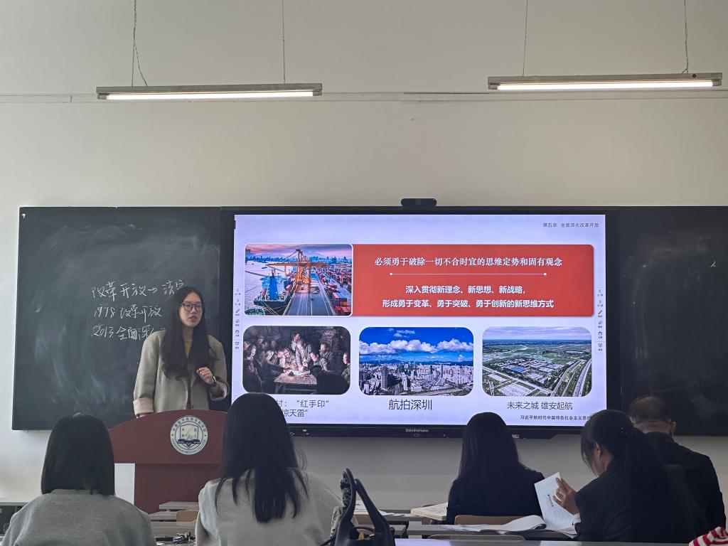 陈媛媛、孙柳等四位青年教师做了教学展示。陈媛媛以《群众路线》为题,注重讲述了群众路线的科学内涵、群众路线的形成逻辑、如何贯彻群众路线等内容。孙柳以《理想信念的内涵与特征》为题,分别讲述了理想信念的内涵与特征。邢书扬以《全面深化改革》为题,从改革开放是我们前进的重要法宝、新时代全面深化改革是一场深刻革命两个方面展开讲解。于小然以《中国式现代化的中国特色》为题,从人口规模巨大、全体人民共同富裕、物质文明和精神文明相协调、人与自然和谐共生、走和平发展道路五个方面讲述了中国式现代化的突出特征。