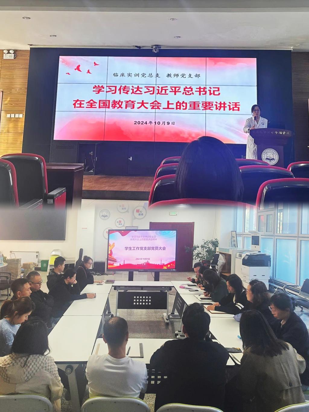 为深入领会全国教育大会精神,学习传达习近平总书记在全国教育大会上的重要讲话,提高党员教师对教育事业的使命感和责任感,10月9日,临床实训党总支教师党支部、学生工作党支部分别召开专题学习会议,集中学习贯彻全国教育大会精神。