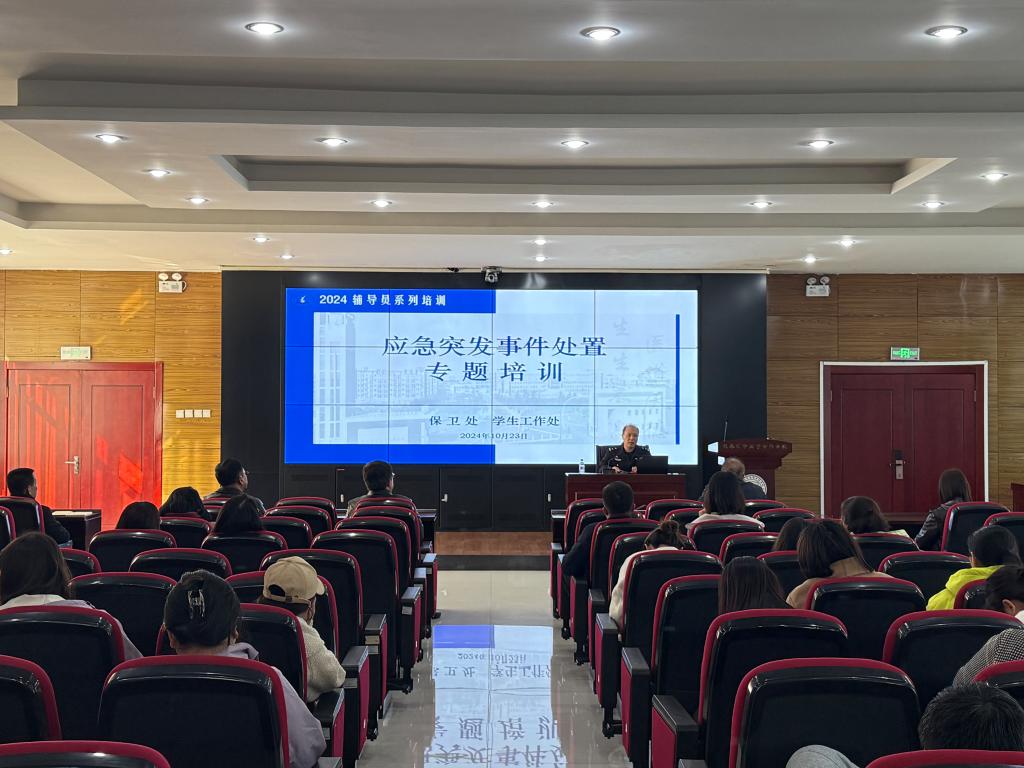 为切实强化辅导员队伍建设,进一步提高辅导员预防和应对处置校园突发事件的工作能力,全面维护校园安全稳定,10月23日下午,保卫处、学生工作处联合在善教楼二楼报告厅召开辅导员应急突发事件处置专题培训会。长春市公安局内保支队高校管理大队大队长王浩受邀作专题培训,学校党委副书记高洪宇出席会议,保卫处处长赵环宇、学生工作处副处长刘思雅、药学党总支书记高雅静、护理党总支副书记杨敬然、全体辅导员、保卫处人员参加培训。会议由学生工作处思政科科长刘雪菲主持。
