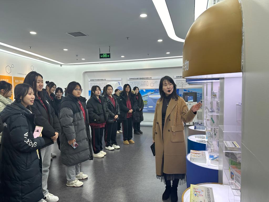 在长春新区规划展览馆,师生们沿着总书记曾经走过的足迹,认真参观了展览馆,详细了解了长春新区整体规划、产业发展、科技创新、法治营商环境建设及重点企业发展等情况。讲解员特别介绍了新区内高科技医药企业,学生们对医药行业的前沿发展趋势有了更为深刻的认知,更加坚定了职业发展方向。