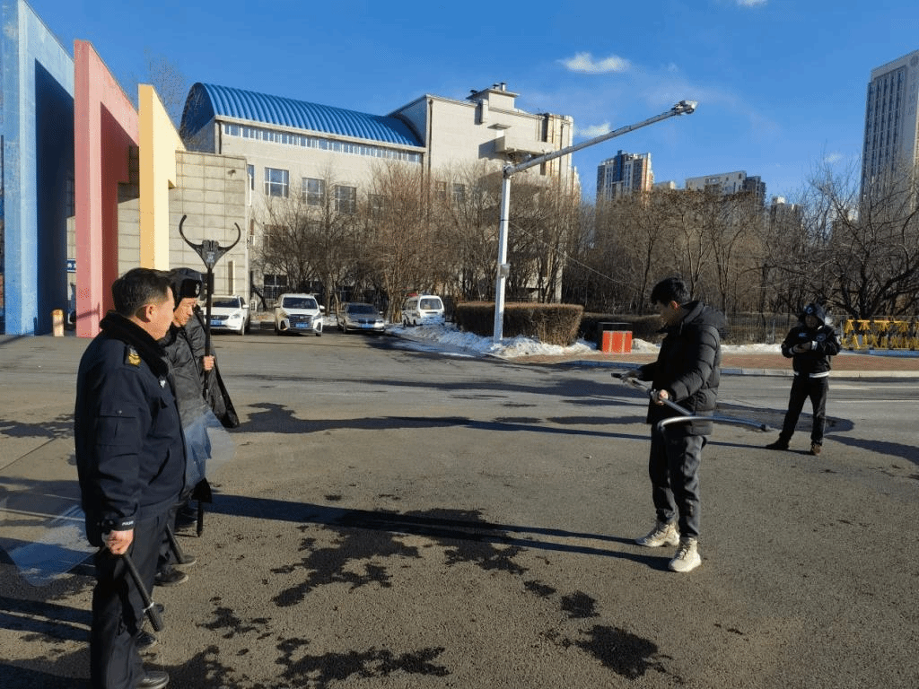 在演示讲解阶段,保卫干事张义鑫讲解突发暴恐事件应急处置流程,指导安防警械使用方法,并进行操作使用示范。在实战演练阶段,参训人员分组进行模拟暴恐事件应对,模拟一名持械“暴恐分子”欲强行闯入校园,安保人员迅速反应,第一时间向保卫处呼叫求援同时携带防暴盾牌、钢叉等器械,采取“作战单元”战术模式与“暴恐分子”对峙周旋。随后增援力量赶到,两个作战单元合力成功将“暴恐分子”制服,并依法移交给现场的公安人员。通过真实场景再现,锻炼应急反应和团队协作能力。整个演练过程严谨规范,各组表现出色,达到了预期效果,为构建和谐安全的校园环境奠定了坚实基础。