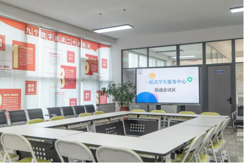 配备会议交互式触控一体机、可拆分桌椅,可容纳30-40人,为各级学生组织、班集体提供交流讨论的空间,可满足日常主题团日、学习分享会等活动需求。
