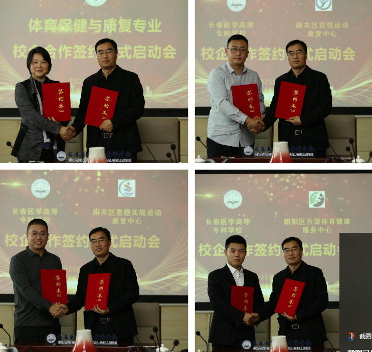 为搭建高质量校企合作平台,培养符合企业需求的职业技能人才,促进信息资源共享,推动职业教育改革与发展,实现教育与产业的深度融合,3月6日上午,我校健康学院在善教楼2楼会议室举行中医养生保健专业、体育保健与康复专业校企合作签约暨揭牌仪式。吉林省体育系统运动创伤医院院长禚志红,南关区君悦运动康复中心总经理王希朋,南关区恩曌实战运动康复中心总经理,孙曌,朝阳区方深体育健康服务中心总经理毕越洋,吉林省沐源润身健康产业集团有限公司董事长王君济,北京吉庆堂中医药研究有限公司总经理赵吉忠,长春市融正堂保健信息咨询中心总经理马建,山东艾公生物科技有限公司总经理曲英华等嘉宾出席签约仪式。我校校长袁兆新、副校长刘洋,教务处处长孙晓琪,健康学院院长张虹、教研室主任和专业带头人参加会议,会议由刘洋主持。