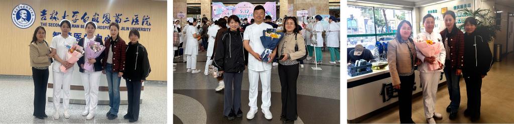 5 月 12 日,学校办公室、护理学院相关人员组成慰问团队,用脚步丈量情谊,先后走访慰问了吉林大学第二医院呼吸与危重症医学科护士长曲丹华、眼表疾病与眼整形美容科护士长张佳璐,吉林大学第一医院卒中中心急诊绿色通道护士李长利,吉林省人民医院护理部副主任李晓芸,浙大附院吉林妇产医院(长春市妇产医院)手术室护士长孟庆云、主管护师于笑言,生修堂中医院院长助理汤宏媛,长春市中心医院心内七科护士长龚明月,南关区新春社区医院健康宣教科科长鲁金凤,吉林大学第一医院乐群院区护理责任组长兼教学组长殷慧、主管护师责任组长孙燕楠、主管护师何行等,另外还通过云端慰问了北京房山区第一医院护理部副主任冯宇、双阳虹桥医院护士长高福建等共14 位护理工作人员。