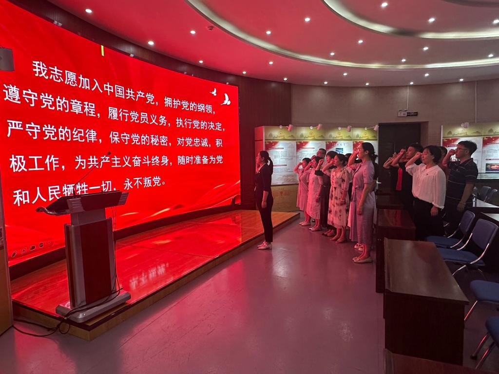 在郑德荣学院的展厅内,教师党员们首先观看了纪录片《红色理论家郑德荣》,详细了解了郑德荣同志的生平事迹。郑德荣同志一生信马、传马、护马的崇高信仰,忠诚于党、忠诚于国家、忠诚于人民的伟大人格,以及严于律己、教书育人、身先垂范的高尚品感染了在场的每一个人。随后,大家在讲解员的引导下参观了郑德荣同志的学术著作、荣誉奖章、生前手稿、往来信函等珍贵展品。这些展品生动地展现了他作为一名共产党员和教育工作者的责任与担当。郑德荣同志在60岁以后累计培养博士生49名,80岁到90岁申请国家级课题3项,书写学术著作5部,发表论文70多篇,直到生命的最后一刻他依然坚持指导学生修改论文。他的这种生命不息奋斗不止的奉献精神鼓舞了在场的每一名党员。活动最后,全体党员在赵欣的带领下重温了入党誓词。一句句誓言铿锵有力、掷地有声,进一步坚定了党员同志们对党忠诚、为民服务的初心和使命。