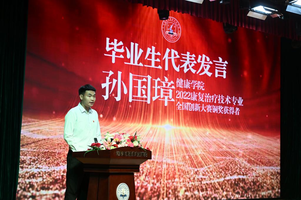 两次代表学校参加全国大学生职业生涯规划大赛并获得铜奖的健康学院孙国璋同学作为2025届毕业生代表,深情回望在长医的三年时光。他分享了学业拼搏、实践探索中的难忘经历,表达了对师长、同窗的不舍和对未来征程的坚定信念。他表示,“这三年,我们不仅收获了专业知识,更培养出医者应有的严谨、坚守与执着。未来,我们将带着所学,奔赴各地,服务社会。”