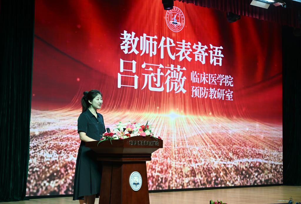 吉林省健康科普专家、健康中国行动宣讲员、吉林省十大魅力教师,临床医学院吕冠薇老师作为教师代表,以长辈和师长的双重身份,深情寄语长医学子。她希望同学们无论走到何方,都不忘求学时的热忱用专业服务社会,以赤子之心迎接挑战,表示母校永远是他们坚实的后盾。
