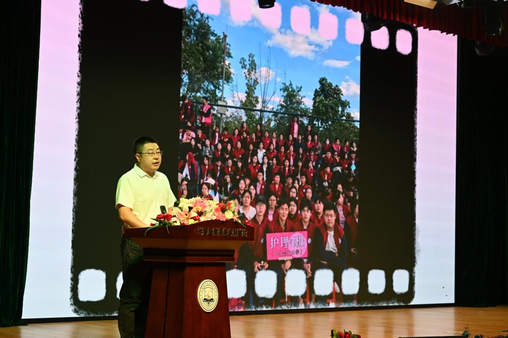 典礼上,学校优秀辅导员、护理学院刘志鹏老师代表全体辅导员发言。他细数与学子们共度的春秋,追忆同学们初入校园的青涩、挑灯夜读的身影、实验室里的专注求索、志愿服务中的无私奉献一个个美好的瞬间。他深情嘱托毕业生应永葆赤诚之心,以校徽为铭,以校训为引,在未来岗位上坚守医者温度,勇于担当责任。