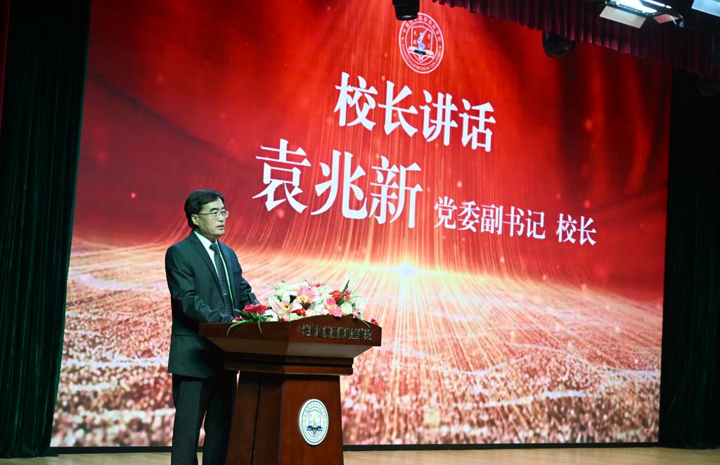 袁兆新在发言中代表学校对全体毕业生表示热烈祝贺。他高度肯定了同学们在校三年期间作为医学生所展现出的坚韧与担当。他希望长医学子在未来的征程上学人参之“沉潜”,在临床沃土中深深扎根;效金银花之“清凉”,于病痛火域间播撒仁心;承黄连之“苦寒”,于浮躁尘世中淬炼心志;应怀甘草之“宽厚”,以仁爱济世;应秉当归之“深情”,以赤子反哺;应立远志之“弘毅”,以诚心守诺。他鼓励同学们永葆仁爱之心与家国情怀,恪守医德,共同书写服务健康中国、健康吉林的时代答卷。