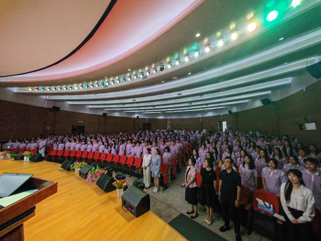 典礼预热阶段,学校宣传片全景式展现了学校的办学积淀、学科优势与育人成果。新生们通过沉浸式观看,直观感受校园文化底蕴与学术氛围,对大学生活的期待感持续升温。伴随着雄壮的中华人民共和国国歌奏响,全体与会人员肃立致敬,典礼正式拉开帷幕,庄严的仪式感让新生深刻认识到医学技术专业的责任担当。