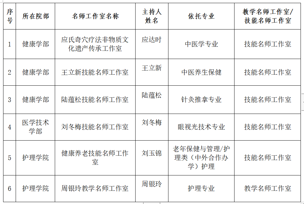 为进一步推进我校名师工作室建设及管理,学校组织了2021年校级名师工作室评选工作,经院部推荐和专家评审,拟定应氏奇穴疗法非物质文化遗产传承工作室等五个工作室评为校级技能名师工作室、周银玲教学名师工作室评为校级教学名师工作室。现将评选结果予以公示(名单附后)。