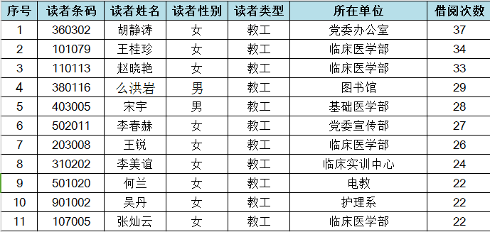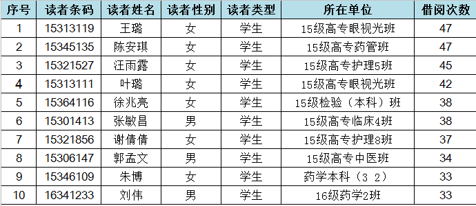 为响应“全民阅读”号召,鼓励广大师生多读书、读好书,图书馆根据2016年1月1日至2017年4月23日的图书借阅数据,按借阅量从高到低,评选出年度“阅读之星”(学生、教工各10名),并于5月9日在图书馆二楼大厅进行现场颁奖,现将获奖名单公布如下: