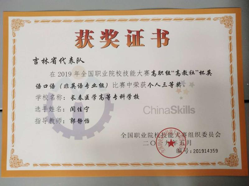 在全国职业院校技能大赛上,长春医学高等专科学校曹益铭、李健锋同学分别获得护理技能大赛的一等奖、三等奖,严佳宁同学获得高职组“高教社”杯英语口语组比赛的三等奖。