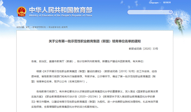 关于我校入选教育部第一批示范性职业教育集团(联盟)培育单位的通报