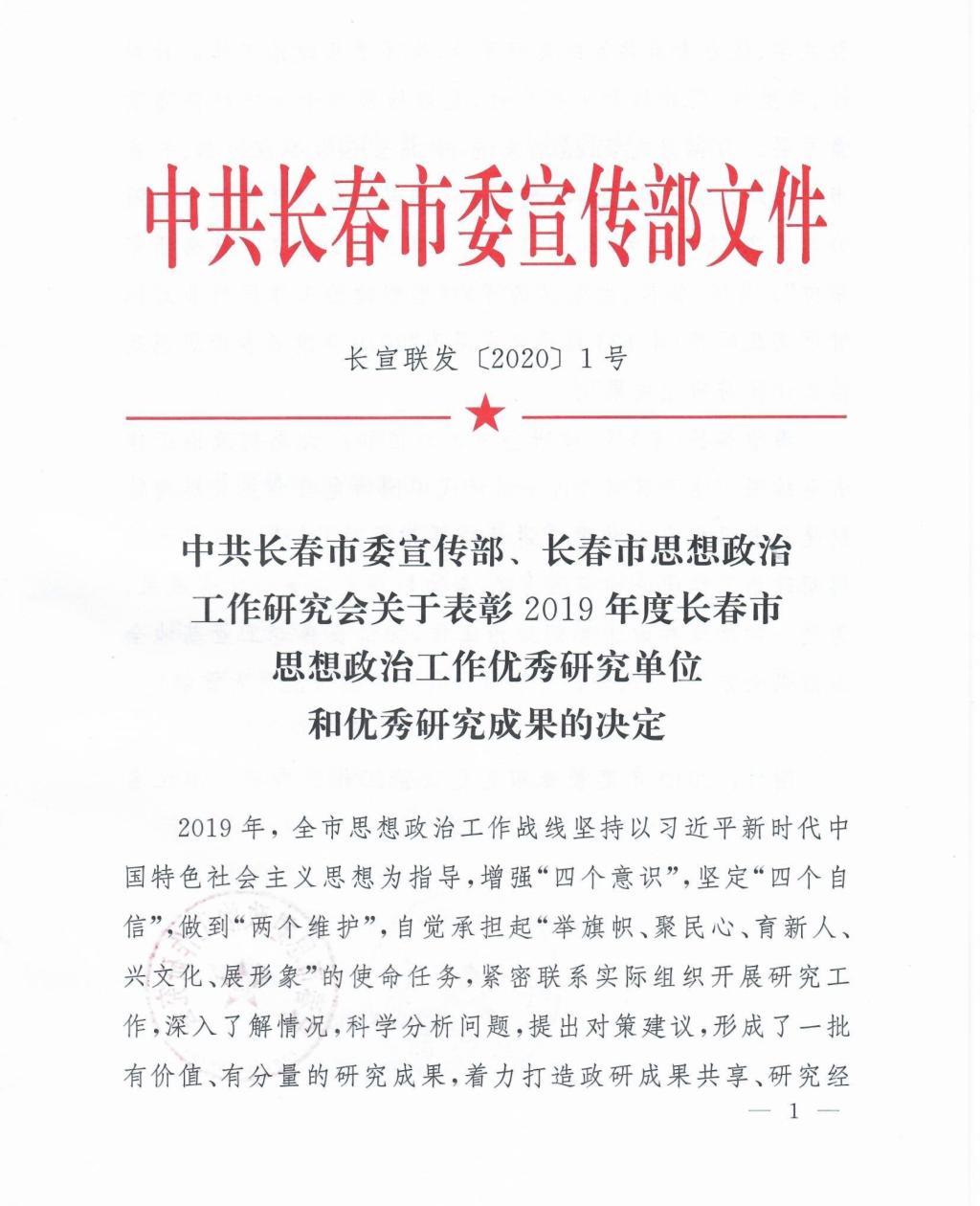 近日获悉,中共长春市委宣传部、长春市思想政治工作研究会联合印发了《中共长春市委宣传部、长春市思想政治工作研究会关于表彰2019年度长春市思想政治工作优秀研究单位和优秀研究成果的决定》(长宣联发【2020】1号),我校获评“2019年度长春市思想政治工作优秀研究单位”称号,我校获优秀研究成果二等奖1项、三等奖2项。获奖如下: