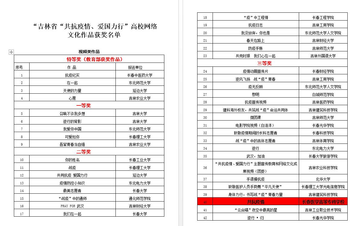 为深入贯彻教育部《关于开展“共抗疫情、爱国力行”主题宣传教育和网络文化成果征集展示工作的通知》文件精神,近日,吉林省委教育工委宣传部会同省高校网络思想政治中心,组织省内高校开展了全省网络优秀作品征集遴选工作。我校宣传部第一时间响应落实,联合校团委组织青马筑梦班学员积极参与,最终由校团委雷明老师指导的由我校青马筑梦班24名优秀学员录制的《共抗疫情》在全省高校449篇网络作品中脱颖而出,荣获了视频类作品三等奖的好成绩。